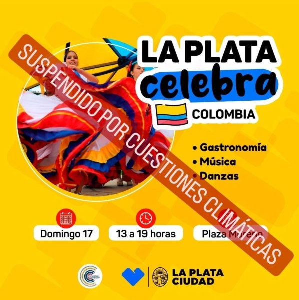 Desde la Comuna dieron a conocer que la edición especial en homenaje a Colombia pautada para mañana en la plaza Moreno fue suspendida debido a la probabilidad de precipitaciones.