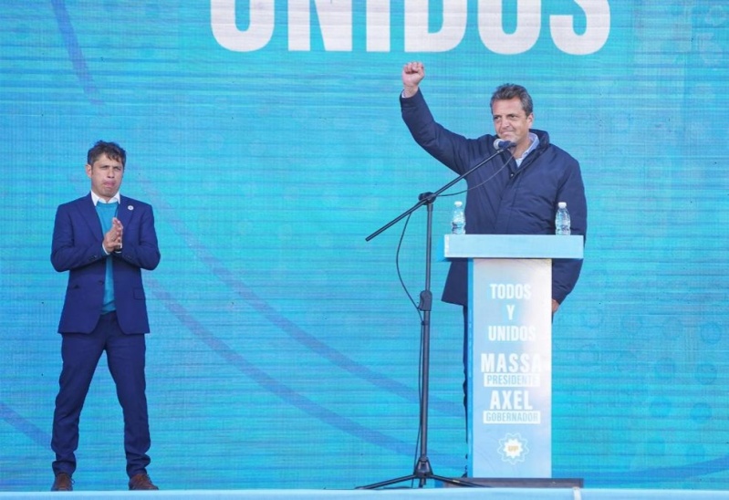 El candidato presidencial de Unión por la Patria y actual ministro de Economía de la Nación, Sergio Massa, y el gobernador de la provincia de Buenos Aires, Axel Kicillof, encabezaron en la tarde de este miércoles, un acto multitudinario bajo la consigna “Todos y Unidos” en la cancha del club Defensores de Cambaceres, en la localidad de Ensenada.