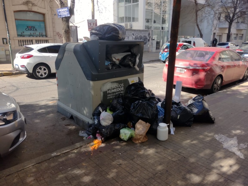 Según se observa en el sitio, tiene una bolsa encima del propio contenedor y también otras desperdigadas por la vereda.