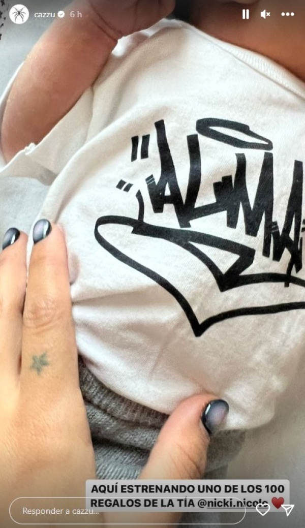 En esta historia se puede ver a su niña, aunque aún no ha mostrado la carita, luciendo un body blanco con el logo del último trabajo discográfico de Nicki: Alma.