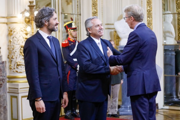 Durante el breve acto, el jefe de Estado y el canciller Santiago Cafiero recibieron y dialogaron con los embajadores de Francia, Alemania, Suecia, Noruega, Hungría, China y Chipre que inician sus misiones en el país.