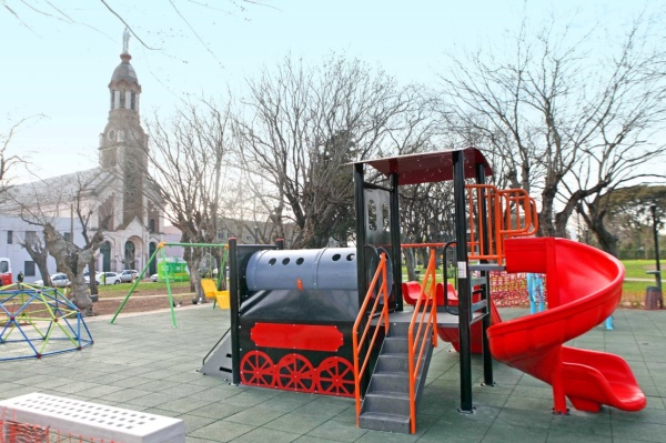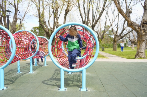 La Municipalidad de La Plata emplazó estructuras lúdicas sobre una amplia superficie antigolpes, un novedoso tren, un mangrullo con túneles y toboganes de diversas alturas y un subibaja con asientos anatómicos y doble barral reforzado.