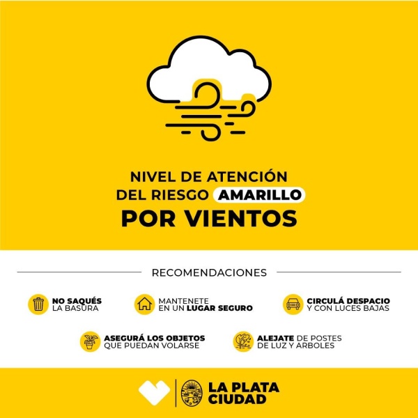La Municipalidad de La Plata elevó el Nivel de Atención del Riesgo (NAR) a 'Amarillo' por tiempo ventoso con ráfagas en la madrugada y la mañana del miércoles. Activan el monitoreo de las condiciones climáticas y tareas de prevención en la vía pública.