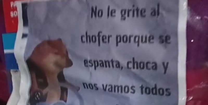 Y, en ese momento, mostró el cartel por el que “la gente se comporta bien”. El papel pegado en uno de los vidrios dice: “No le grite al chofer porque se espanta, choca y nos vamos todos”.