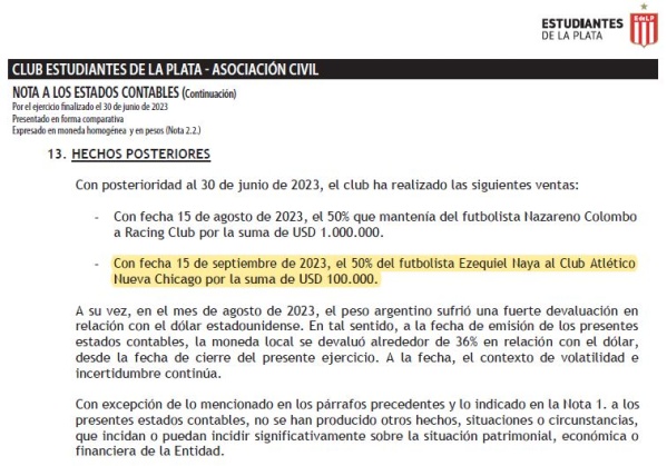 Según se aprecia en la imagen, Estudiantes informa que se realizaron dos ventas. Una de ellas es la de Nazareno Colombo, que fue vendido por Defensa y Justicia a Racing en una cifra que trascendió como cercana a los tres millones de dólares y que representó, por haber tenido el 50% de la ficha, un ingreso de un millón de dólares para el club platense. Sin embargo, la segunda de las ventas detalladas es la de Ezequiel Naya a Nueva Chicago, una operación que nunca fue realizada pese a los rumores preeexistentes y que oficialmente ya está descartada. Tal cual lo comunicó este portal, el joven delantero se despidió ayer a través de sus redes sociales del club de Mataderos y ya se prepara para retornar al "Pincha".