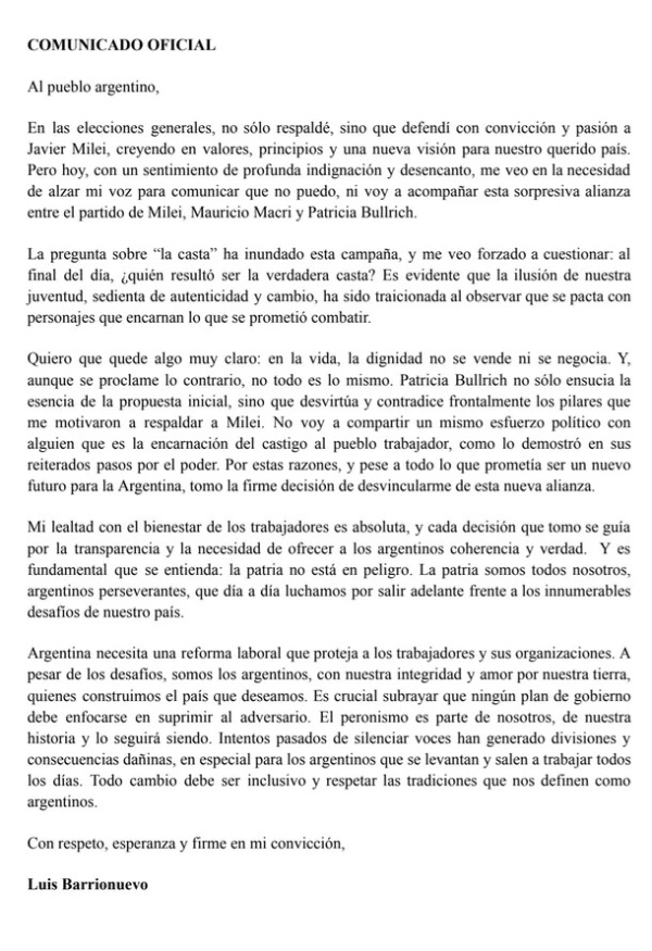 "Pero hoy, con un sentimiento de profunda indignación y desencanto, me veo en la necesidad de alzar mi voz para comunicar que no puedo, ni voy a acompañar esta sorpresiva alianza entre el partido de Milei, Mauricio Macri y Patricia Bullrich", manifestó Barrionuevo en un comunicado difundido esta mañana.