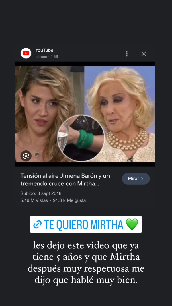 En primera instancia, subió a sus historias de Instagram un video de You Tube cuando ambas se habían “cruzado” al aire, pero a modo de compartir y recordarlo como gracias Jimena mencionó, “Les dejo esta video que ya tiene cinco años y que Mirtha después muy respetuosa me dijo que hable muy bien. Te quiero Mirtha”.