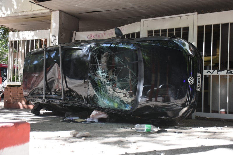 De acuerdo al reporte policial, todavía no están esclarecidas las causas del accidente. Lo que se produjo fue el vuelco de un vehículo VW SURAN, que impactó sobre el portón de un edificio.