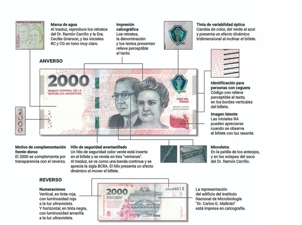 -Medidas de seguridad. Diseñado en colaboración con Casa de Moneda Argentina, el billete de 2000 pesos cuenta, entre otras, con las siguientes medidas de seguridad: