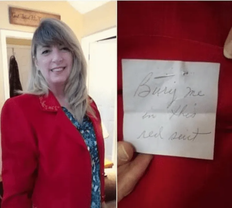 La ciudadana estadounidense llamada Joann decidió asistir a una feria americana organizada por una agrupación benéfica en Florida con el propósito de conseguir ropa a bajo costo para renovar su armario. Para su sorpresa, el saco que compró tenía un mensaje en su bolsillo que decía: “Entiérrenme con este traje rojo "