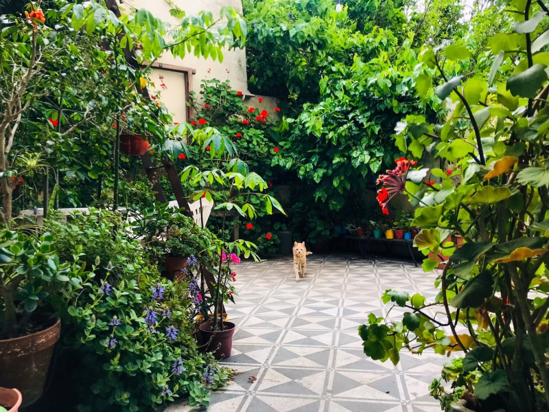 El usuario @gomezeibra compartió una imagen de su increíble patio repleto de plantas, flores y adornos verdes. En el medio de él, su tierno gato.