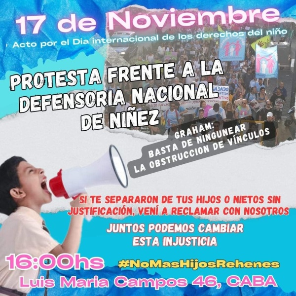 Desde las 16 horas se desarrollará en la Ciudad de Buenos Aires una protesta frente a la Defensoría Nacional de la Niñez para visibilizar la problemática de la Obstrucción de Vínculos. Hablan de una epidemia de falsas denuncias.