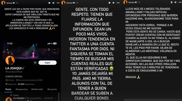 No conforme con esas dos historias en Instagram, agregó una tercera, cansada de este tipo de situaciones: “Llevo más de 6 meses tolerando amarillismo y falsas noticias difundidas por personas que quieren hacerme mal, guardándome todo para mí, haciendo vista gorda porque a mi estas cosas no me gustas, pero esta gente no se casa”, contó La Joaqui.