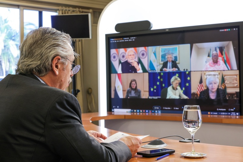 El presidente Alberto Fernández celebró hoy "los avances en la negociación para lograr la liberación de rehenes y un alto el fuego" durante su exposición en la Cumbre virtual de líderes del G20, organizada por la República de la India.
