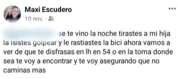 “Se te vino la noche, tiraste a mi hija, la hiciste golpear y le robaste la bici, ahora vamos a ver de qué te disfrazas en Los Hornos, ya sea en 54 o en la toma, donde sea te voy a encontrar y te voy asegurando que no caminás más”, publicó en ese momento.