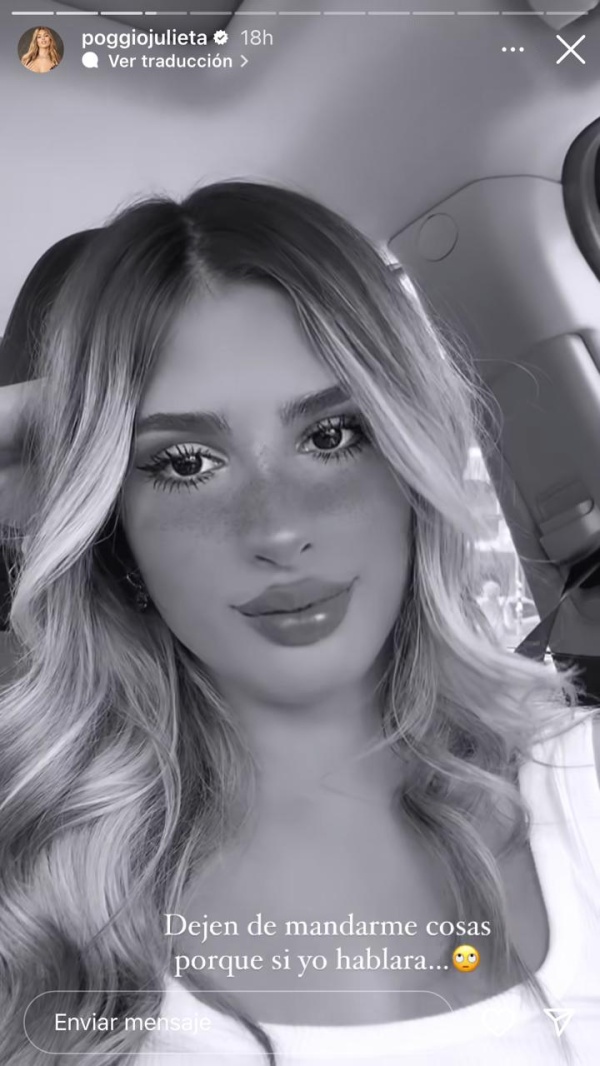 Sin nombrarlo, pero visiblemente molesta e indignada, Juli hizo un fuerte descargo a pocas horas de que se viralizaran las tremendas declaraciones de su ex. “Dejen de mandarme cosas, porque si yo hablara...”, sentenció, junto al emoji con los ojitos hacia arriba, en señal de hartazgo.