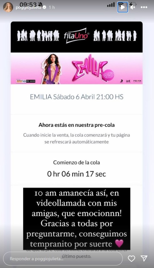 Fue así como la actriz de Coqueluche se expresó en las redes y mostró su emoción tras haber conseguido los tickets. “10 am amanecía así, en videollamada con mis amigas, que emoción”, escribió Julieta en sus historias de Instagram mostrando una captura de la pre-cola.