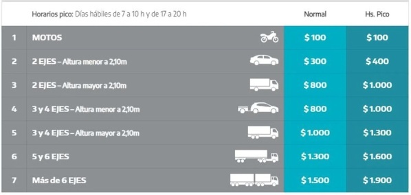 De acuerdo con el nuevo cuadro tarifario, las motos pagarán 100 pesos en ambos casos, los autos 300 y 400 respectivamente y aquellos vehículos de dos ejes y más de 2,10 metros de altura pagarán 800 pesos en horario normal y 1.000 en horario pico.