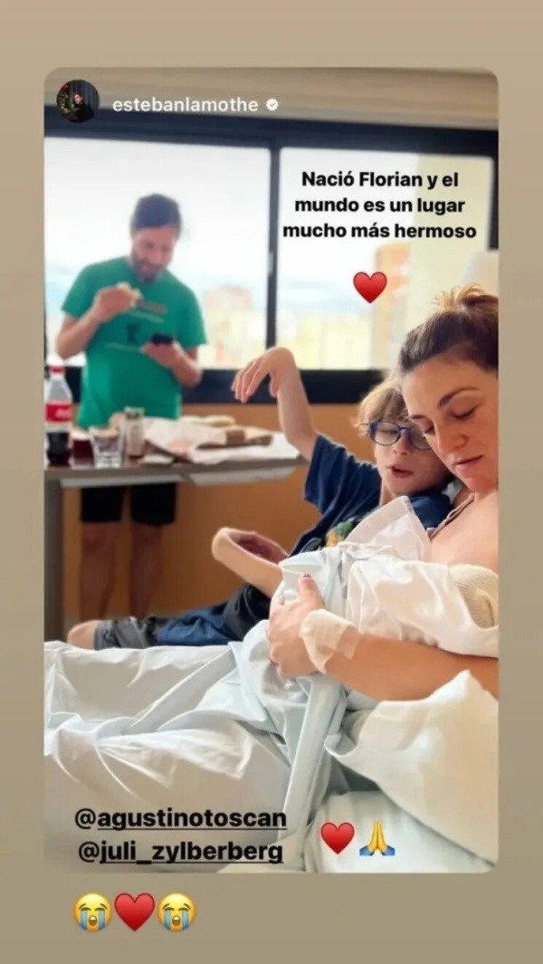 Sin duda son una familia ensamblada ya que Lamothe compartió una foto en la que escribió: "Nació Florián y el mundo es un lugar mucho más hermoso". En la foto que subió a Instagram el actor se ve a su ex, acostada junto a su hijo en común y al nuevo integrante de la familia, y algo borroso en el fondo aparece Agustín Toscano.