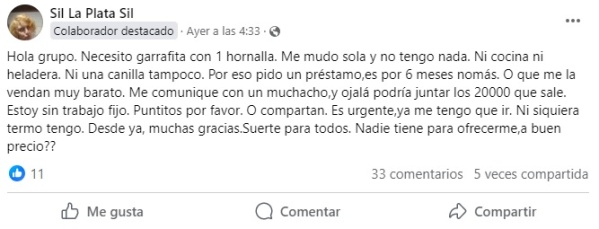 Ante esta situación, publicó en varios grupos de Facebook que necesita una garrafa con una hornalla: “Me mudo sola y no tengo nada, ni cocina ni heladera, tampoco una canillo, por eso pido un préstamo, es por seis meses nomás, o que me la vendan muy barato”, explicó en su posteo.