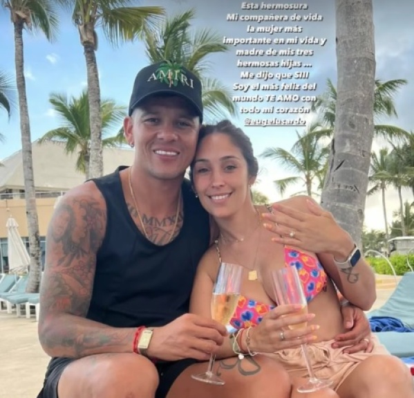 “Esta hermosura, mi compañera de vida, la mujer más importante en mi vida y madre de mis tres hermosas hijas... Me dijo que sí. Soy el más feliz del mundo, te amo con todo mi corazón”, le dedicó él a ella, muy enamorado e ilusionado por lo que está por venir.