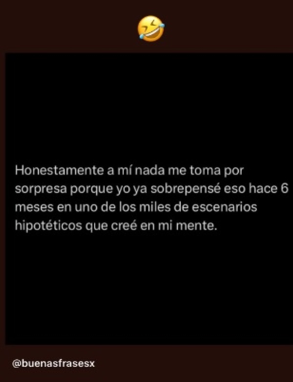 “Honestamente, a mí nada me toma por sorpresa, porque yo ya sobrepensé eso hace seis meses, en uno de los miles de escenarios hipotéticos que creé en mi mente”, dice el posteo que compartió, sumando el emoji que llora de la risa, deslizando que ella es de esas personas.