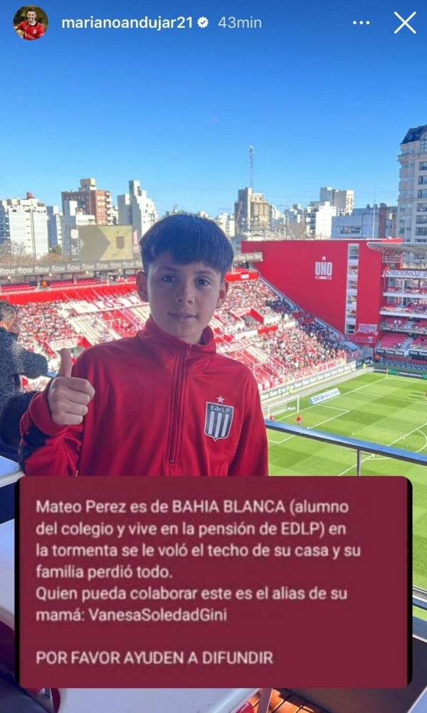 Estudiantes, entonces, decidió iniciar una campaña solidaria para colaborar con su familia, en Bahía Blanca, y a través de las redes sociales difundió el pedido de ayuda, dado que su casa natal sufrió la voladura del techo. Para contribuir se puede hacer una donación mediante el alias de su madre: VanesaSoledadGini. Esta misma iniciativa fue compartida por el propio Juan Sebastián Verón y Mariano Andújar, entre otros.
