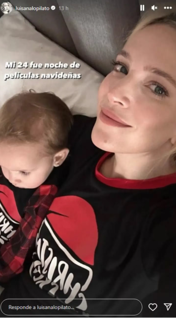 La conductora hizo eco a través de sus stories de una selfie que la muestra haciéndole “upa” a Cielo, mientras lucen el mismo buzo negro con letras blancas y detalles rojos. “Mi 24 de diciembre fue noche de películas navideñas”, expresó Lu, que miró más de un film con su hijita.