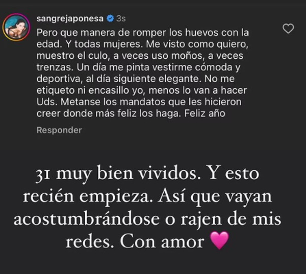 Luego, dejó en claro que no necesita la aprobación de nadie. “Me visto como quiero, muestro el culo, a veces uso moños, a veces trenzas. Un día me pinta vestirme cómoda y deportiva, al día siguiente elegante. No me etiqueto ni encasillo yo, menos lo van a hacer ustedes. Métanse los mandatos que les hicieron creer donde más feliz los haga. Feliz año”, agregó de forma contundente.