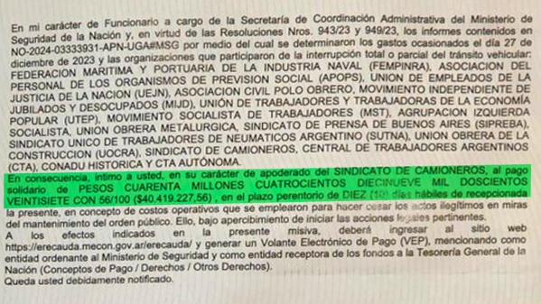 "Intimo a usted, en su carácter de apoderado del sindicato de Camioneros, al pago solidario de pesos cuarenta millones cuatrocientos diecinueve mil doscientos veintisiete con 56/100 ($40.419.227,56), en el plazo perentorio de diez (10) días hábiles de recepcionada la presente, en concepto de costos operativos que se emplearon para hacer cesar los actos ilegítimos en miras del mantenimiento del orden público", indica el texto de la misiva.