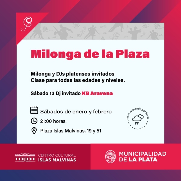 El ciclo “Milonga de la Plaza” ofrecerá un espacio para los amantes del compás 2x4 de distintas generaciones y diferentes niveles de formación, y contará con la participación de Tango DJ’s platenses que serán invitados para musicalizar cada encuentro, sábado tras sábado.