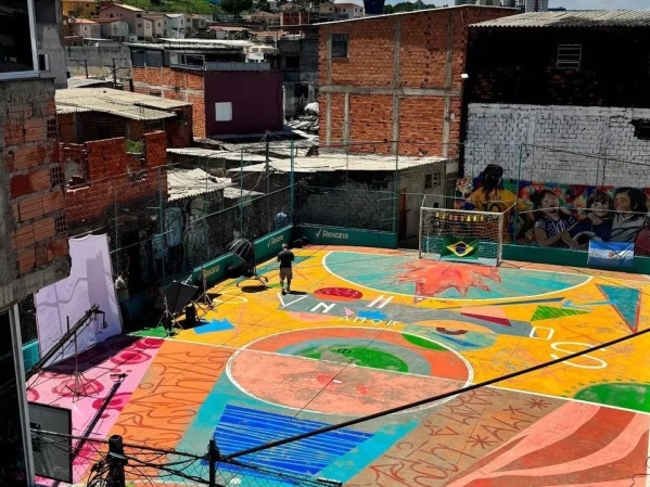 En sus historias de Instagram, donde tiene más de 14 millones de seguidores, la conductora subió algunas imágenes del backstage. Filmó la favela y escribió “locación del día”, donde se puede ver una cancha de fútbol en medio de las viviendas, pintada de muchos colores y con las banderas argentina y brasileña, y reveló el catering del video: los pan de queso típicos de Brasil.