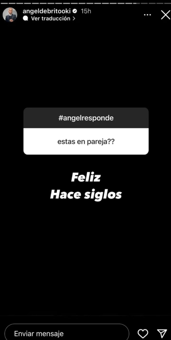 Sin embargo, por primera vez, dio pistas sobre su noviazgo. “¿Estás en pareja?”, quisieron saber sus seguidores. Entonces, Ángel dijo que sí. “Sí, estoy feliz... Desde hace siglos”, sentenció el comunicador, revelando que está de novio hace un montón de tiempo.