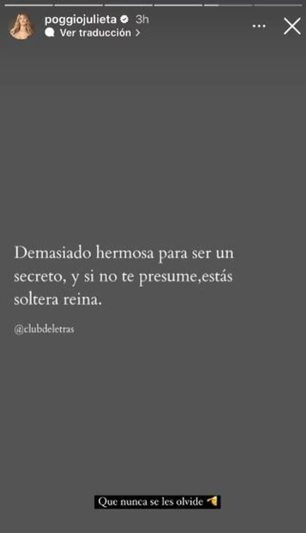 De armas tomar, pero sin arrobar a ninguna persona en especial, Julieta lanzó un picante mensaje en redes sociales, casualmente, minutos después de que el hermano de Tini Stoessel afirmara en Rumis que con Poggio solo tenía una amistad.