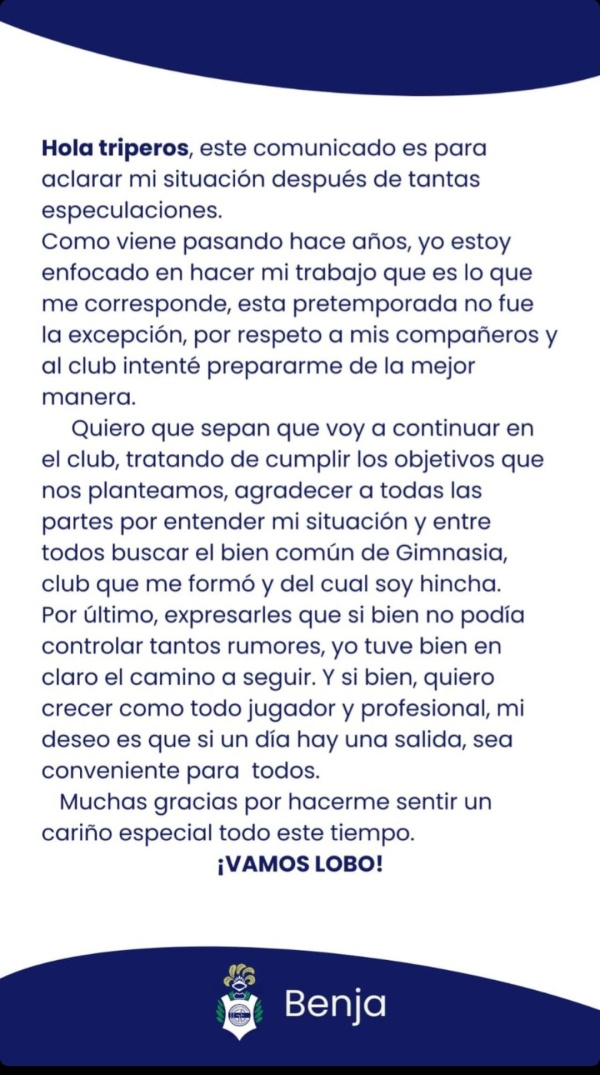 En ese sentido, el juvenil aclaró hace apenas minutos su situación y dejó en claro en una comunicado en su cuenta personal que continuará en el club. De esta forma, alejó los rumores sobre una hipotética salida en estos días y echó por tierra la chance de ser vendido a Talleres de Córdoba, club que estuvo interesado en contratarlo y estuvo en negociaciones formales con la dirigencia albiazul. Sin embargo, más allá de asegurar su continuidad, evitó hablar sobre su contrato y dejó más incertidumbre respecto de si aceptará la renovación o no.