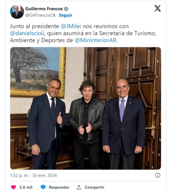 Daniel Scioli fue designado por el Gobierno de Javier Milei como nuevo secretario de Turismo, Ambiente y Deporte. La designación fue confirmada por el ministro del Interior, Guillermo Francos: "Junto al presidente @JMilei nos reunimos con @danielscioli, quien asumirá en la Secretaría de Turismo, Ambiente y Deportes de @MinInteriorAR".
