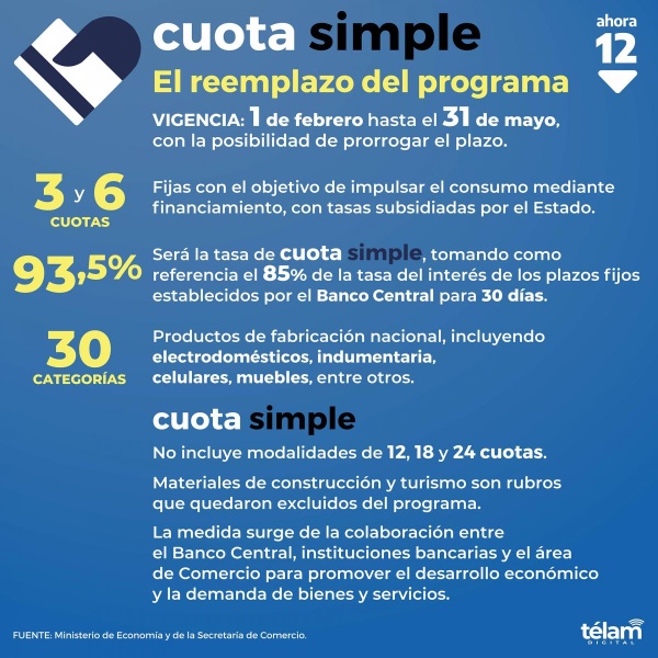 El programa Cuota Simple, que sustituye a Ahora 12, entró en vigencia este jueves y estará vigente hasta el próximo 31 de mayo, con el objetivo de fomentar el consumo brindando la posibilidad de financiar compras en tres y seis cuotas fijas -quedando discontinuadas las 12, 18 y 24 cuotas- con tarjetas de crédito bancarias y "con la tasa más baja del mercado", destacaron desde el Ministerio de Economía y de la Secretaría de Comercio.