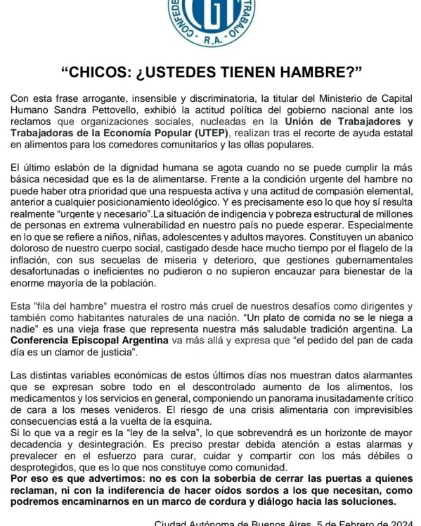 "Con esta frase arrogante, insensible y discriminatoria, la titular del Ministerio de Capital Humano Sandra Pettovello, exhibió la actitud política del Gobierno nacional ante los reclamos que organizaciones sociales, nucleadas en la Unión de Trabajadores y Trabajadoras de la Economía Popular (UTEP), realizan tras el recorte de ayuda estatal en alimentos para los comedores comunitarios", criticaron desde la CGT.