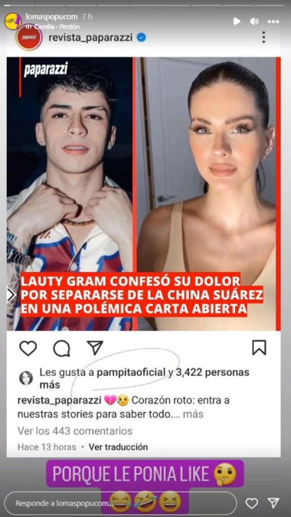 Aunque está claro que el like de Pampita fue un error de la modelo en redes sociales, no pasó inadvertido entre sus miles de seguidores. Desde la cuenta de Instagram Lo Más Popu, compartieron captura y se preguntaron: “¿Por qué le ponía like Pampita?”.