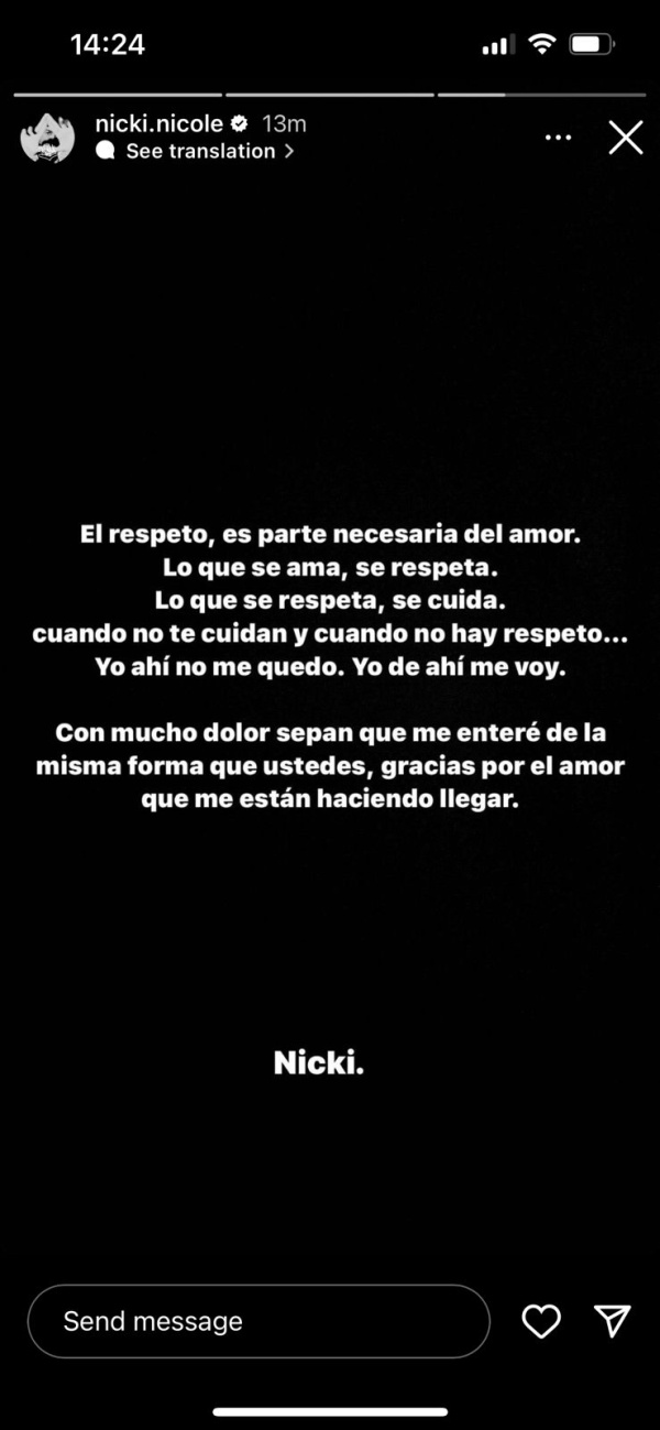 “El respeto es parte necesaria del amor. Lo que se ama, se respeta. Lo que se respeta, se cuida. Cuando no te cuidan y cuando no hay respeto... yo ahí no me quedo. Yo de ahí me voy”, comienza el escrito, que finaliza con una sentida revelación: “Con mucho dolor sepan que me enteré de la misma forma que ustedes, gracias por el amor que me están haciendo llegar”.