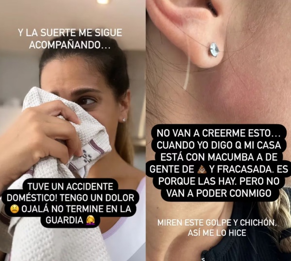 Luego de emitir un fuerte descargo en contra de sus vecinos, la mediática regresó a sus redes sociales para contar lo sucedido. “Tengo un dolor... Ojalá no termine en la guardia”, comenzó muy preocupada, acompañando con una foto del golpe y el chichón que le quedó en su mandíbula.