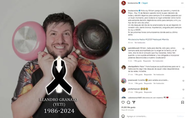 Leandro Granato, creador de la cuenta de Instagram y de TikTok Bruta Cocina, murió este miércoles. Así lo informó Miriam, su pareja, con un comunicado en las redes. Tenía 38 años.