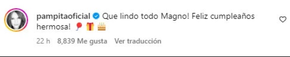 "Que lindo todo Magno! Feliz cumpleaños hermosa!", escribió la modelo, felicitando a la hermana de sus hijos.En el posteo de la actriz, se pudo ver intimidades de la fiesta de su hija, como el momento de soplar las velitas o la diversión que se respiró en todos lados por parte de los invitados.