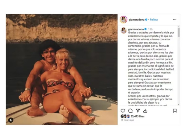 Por último, la hija de Claudia y Diego, concluyó: “Gracias por un nosotros, gracias por enseñarme con su ejemplo, por darme la posibilidad de elegir lo a verdaderamente importa y es real. Gracias por mi hermana, mi luz en la oscuridad“, comentó nombrando por primera vez a Dalma Maradona y cerró: “Los elegiría para siempre una y otra vez... LOS AMO INFINITO y les agradezco profundamente por ser los mejores padres del mundo para mi. Su fortaleza es la mía y voy a luchar siempre por la verdad con entereza, fuerza y corazón”.