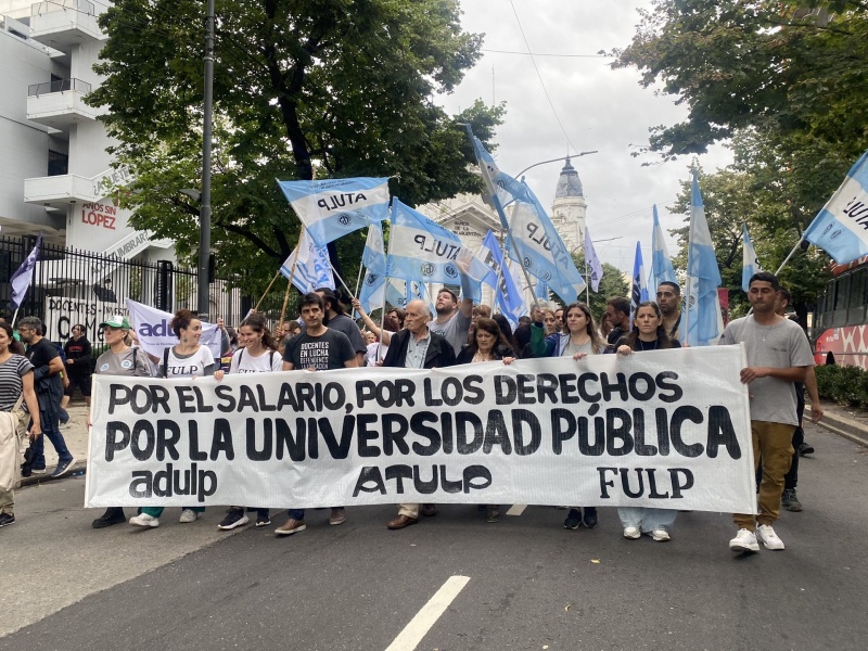 El paro nacional de los docentes universitarios tuvo el apoyo de los gremios locales: la Asociación de Trabajadores Universitarios de La Plata (ADULP), la Asociación de Docentes de la Universidad de La Plata (ADULP) y la Federación Universitaria de La Plata (FULP) manifestaron su adhesión a la medida