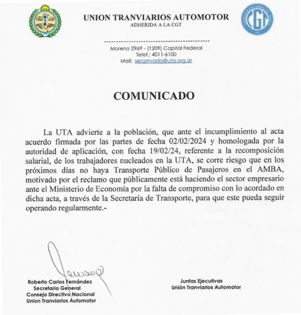 En este marco, la UTA publicó un comunicado en el cual advierten "a la población" que, "ante el incumplimiento al acta acuerdo firmada por las partes de fecha 02/02/2024 y homologada por la autoridad de aplicación, con fecha 19/02/2024, referente a la recomposición salarial, de los trabajadores nucleados en la UTA, se corre riesgo que en los próximos días no haya Transporte Público de Pasajeros en el AMBA".