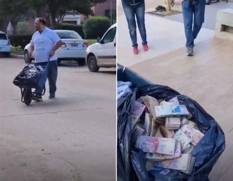 “No tengo un maletín para traer tanta plata así que la traigo en carretilla”, dijo el protagonista de este hecho aludiendo a la cantidad de dinero que debe pagar para mantener su local. Según se alcanza a ver en el video del momento, la plata estaba adentro de una bolsa de consorcio, dividida en fajos. “Voy a pagar la luz que me vino en el negocio: $840 mil pesos”, recalcó agobiado por la situación.