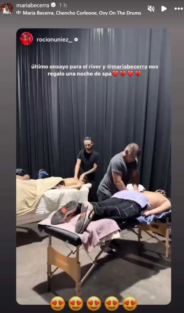 “Último ensayo para River... Y María nos regaló una noche de spa”, expresó la coreógrafa, junto a un montón de emojis de corazones, al pie del video que muestra a los bailarines recostados sobre camillas recibiendo masajes antes del día tan esperado por todos.