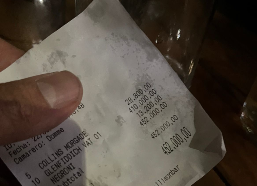 “Ayer fui a un bar en Palermo con 3 amigos a tomar unas copas. Dos horas estuvimos. Tomamos whisky, 10 medidas. Sillas de madera de pino, todo bastante precario.452000 pesos la cuenta. Ni en Manhattan creo que pagué casi 450 dólares unos copetines”, sostuvo.