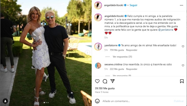 “Feliz cumple a mi amiga, a la panelista número 1, a la que me manda los mejores audios de indignación matinal, a la descargadora serial, a la que me entiende con la mirada, a la polifacética que nunca te deja a gamba. Me gusta siempre verte feliz con la gente que te quiere”. le escribió el conductor.